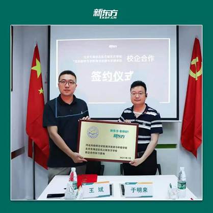 在北京市海淀区私立新东方学校,领导致辞后共同观看了双方的宣传视频,并就学生的培养、课程建设、教育实习、就业及未来发展等进行了深入探讨,最后双方进行签约。