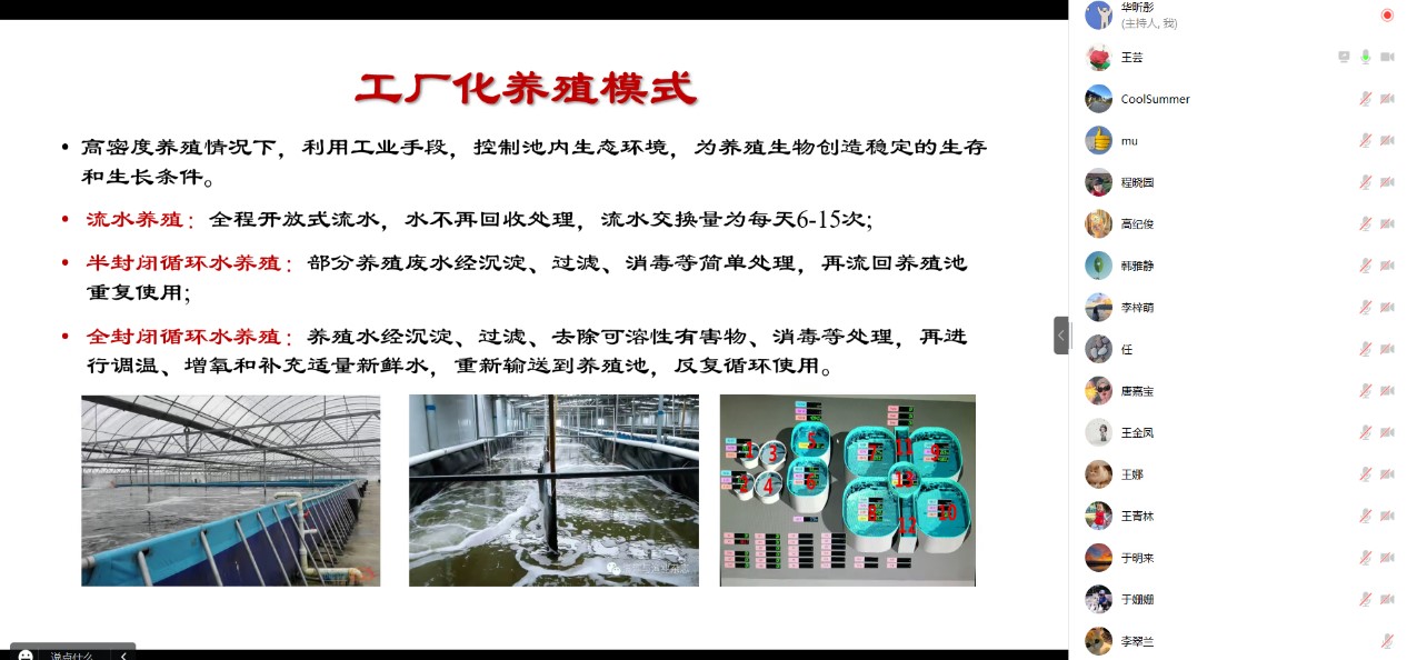 王芸副研究员做了题为“对虾养殖品种与养殖模式概况”的报告,主要介绍我国对虾养殖产业的发展历程和水产养殖对虾的主要品种,以及目前对虾养殖的主要模式,同时特别介绍了以粤西地区的鱼虾混养模式为代表的养殖模式的优缺点以及虾稻共作等养殖模式,并讲解了养殖过程的关键调控技术。